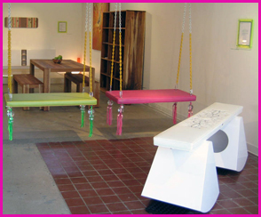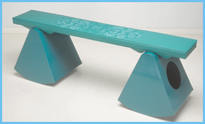 Designed for swaying, friends and fun. The bench is upholstered vinyl with custom designed embroidery at 6' x 12" x 2" can fit you and a few. The two powdercoated aluminum bases are 22 1/2" x 21 1/2" x 16".