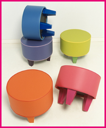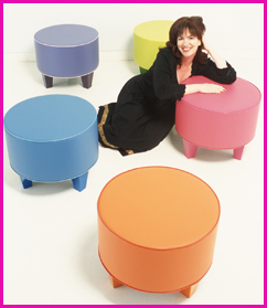 Rearrange, sit, eat, dance on any of Lucy's Rounds.Upholstered vinyl circular units at 24" d. and 17" off your shag carpet! The funky feet are bent hot rolled steel, powder coated in glitter colors. Tickle your toes on the "Fab Fur" underside. Five fun colors plus black and white.