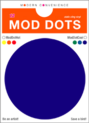 Multi-colored static cling vinyl in 5.5" round dots for your windows. Peel off paper backing and stick Mod Dots clean windows. They do not leave a sticky residue and keep your backing, as Mod Dots are reusable.