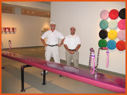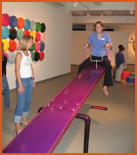 "Didi Dunphy’s work takes a playful tone. Her vividly colored upholstered creations transport the viewer to the realm of the playground. Her oversized see-saw constructed from raspberry metal flake Naugahyde and complete with pink-fringed handle bars invites viewers to climb aboard and rekindle childhood memories. While borrowing the simple lines and bold colors from earlier art movements, Dunphy’s work offers a counterpoint to the austerity and purity of minimalism and hard-edge painting." -- George Kinghorn, Chief Curator